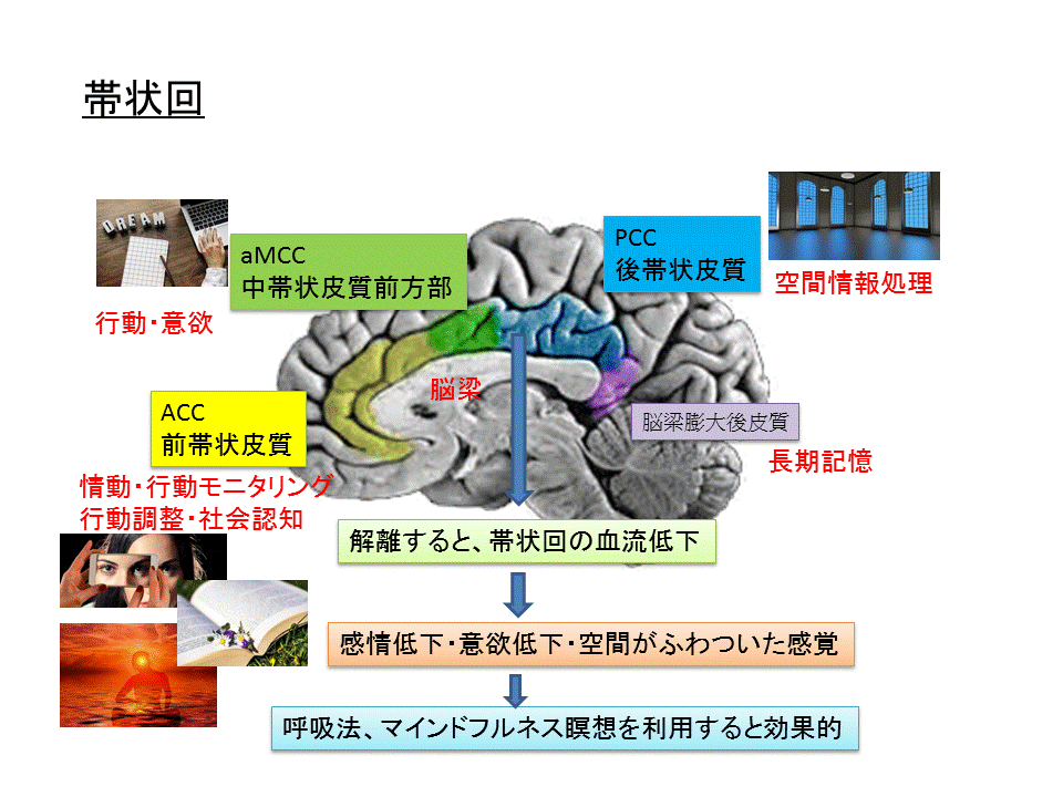 帯状回はいくつかの領域に分かれ、前帯状回(ACC)は社会と関わっていくシステム、前中帯状回(aMCC)は行動意欲に関わるシステム、後帯状回は空間認知に関わるシステムを有しています。