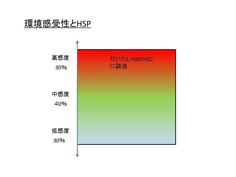 この分布は正規分布に近く、連続的な特性(スペクトラム グラディエーション分布)として特徴づけられる概念であるため、誰もが感受性を持っており、その強度に個人差があるという前提に立っています。そのため、HSPか非HSPであるかをはっきり切り分ける明瞭な基準もありません。