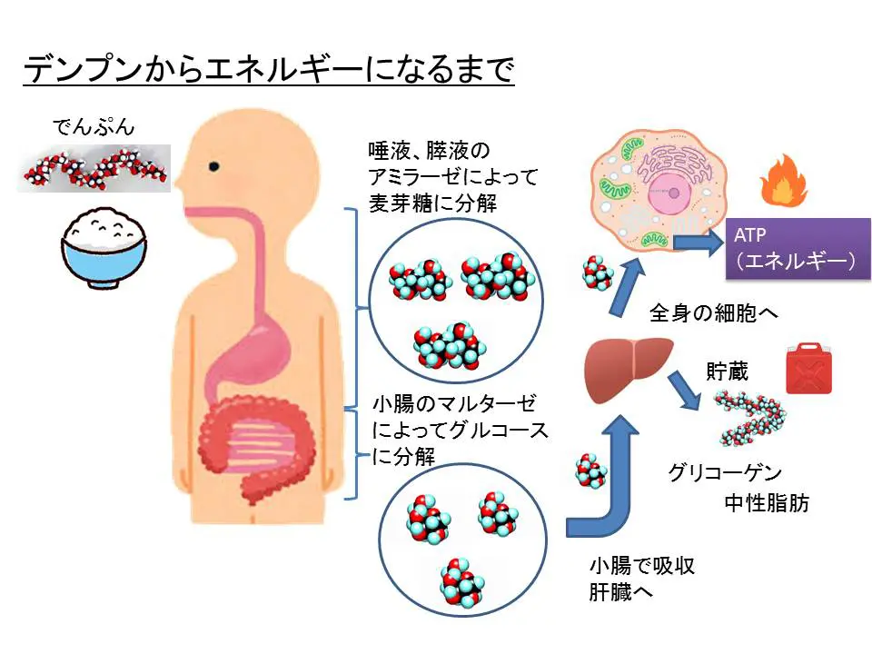 食物に多く含まれるでんぷんは、ぶどう糖が多数つながった鎖状の多糖類です。体内では分子が大きすぎてそのままでは消化できないため、唾液や膵液の酵素によって結合が一つずつ切り離され、二糖類の麦芽糖(マルトース)を経て、最終的に単糖のぶどう糖になります。