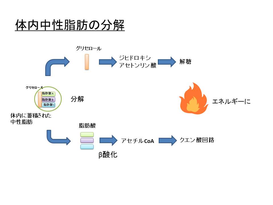 必要に応じて中性脂肪は分解され、解糖系やクエン酸回路を経てエネルギー源として利用されます。
