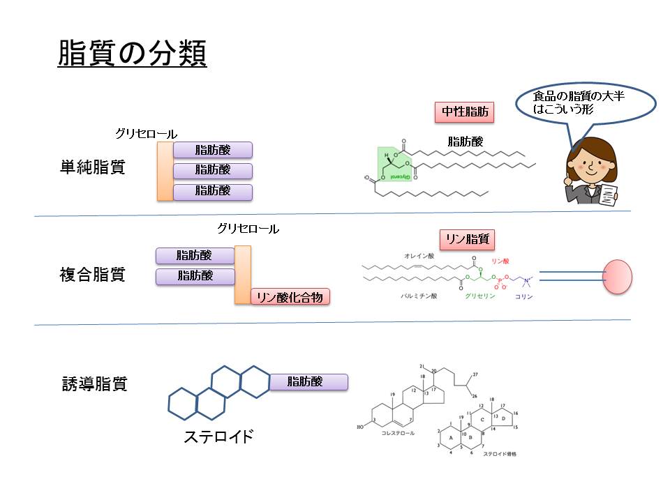 脂質は化学構造の違いによっても「単純脂質」、「複合脂質」、「誘導脂質」の3種類に分類されます。