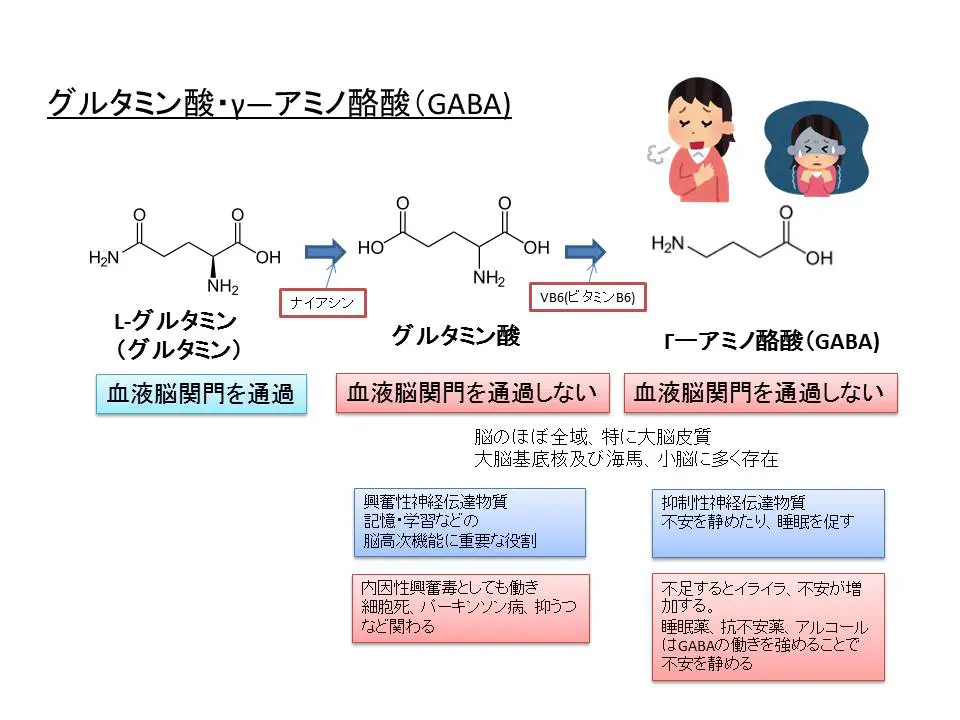 脳内で神経伝達物質として働くグルタミン酸は、体内に豊富に存在するグルタミンが血液脳関門を通過し、脳内でナイアシンを補酵素として利用する反応によって生成されます。