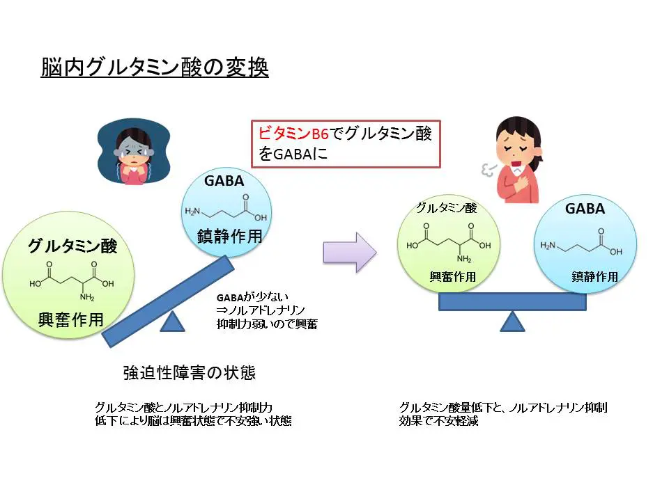 強迫性障害のある人では、脳内のグルタミン酸がGABAより優位になっている傾向が指摘されており、その背景の一つとして、ビタミンB6不足によりGABAへの変換が十分に進まない可能性が考えられています。