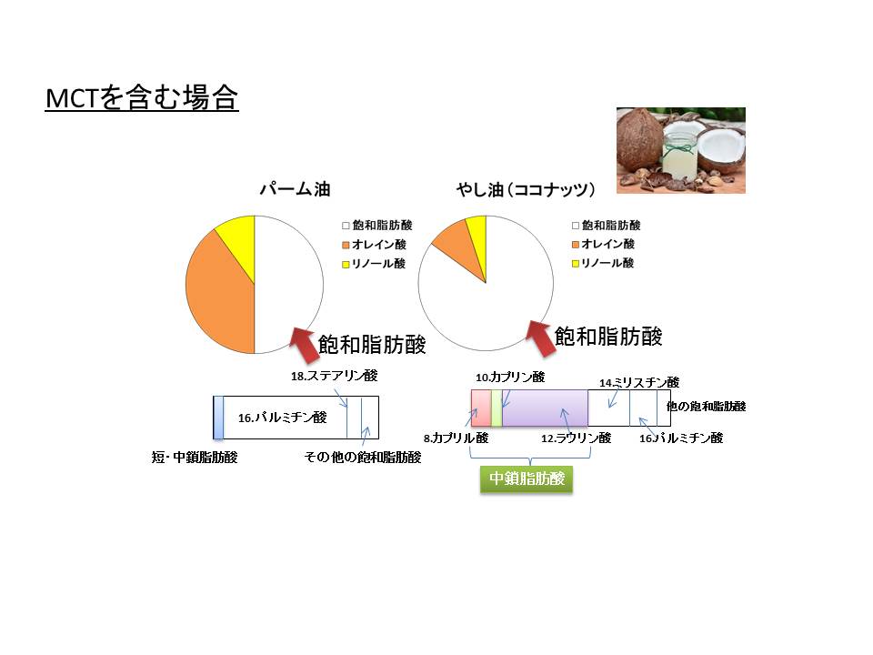 パーム油は、短、中鎖脂肪酸がほとんど含まれておらずほとんどが長鎖脂肪酸(パルミチン酸、ステアリン酸)です。