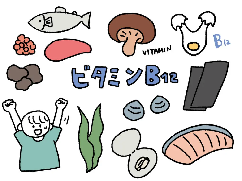 ビタミンB₁₂は、葉酸と協力して骨髄での造血を促し、貧血を予防する働きをもつビタミンです。このことから「赤いビタミン」とも呼ばれています。