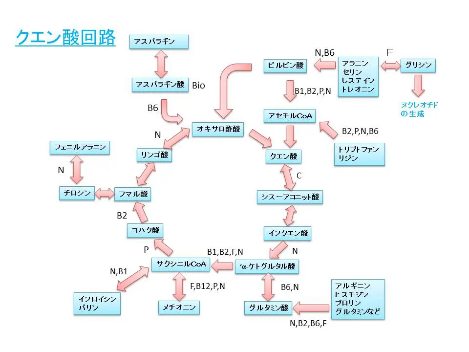 これら一連の反応を円滑に進めるためには、多くのビタミンB群やミネラルが補酵素として働いています。