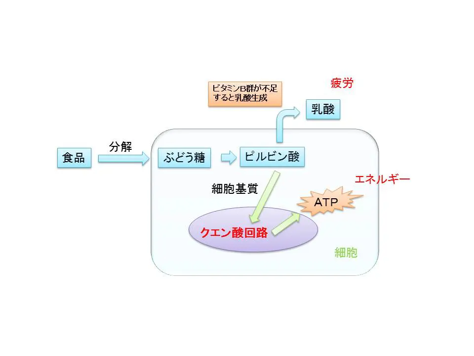 ビタミンB₁が不足すると、このエネルギー生成の回路がうまく作動せず、代わりに疲労物質である乳酸が蓄積します。その結果、疲れやすくなったり、筋肉痛が起こりやすくなったりします。