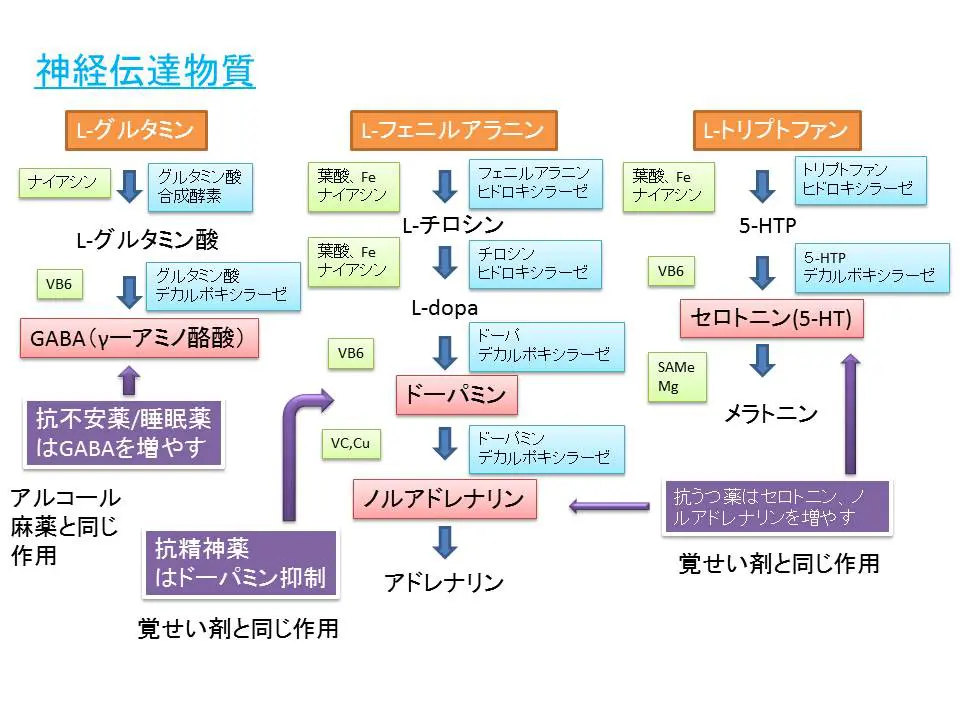 ドーパミンやノルアドレナリンはタンパク質由来のフェニルアラニンから、セロトニンは同じくタンパク質由来のトリプトファンからつくられますが、これらの変換反応を進めるには酵素が必要です。